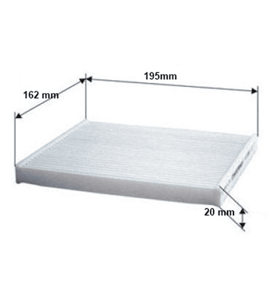 Filtro polen Suzuki Modelos : - Alto 2004 al 2016 - Celerio 2009 - 2020 - S-Presso 2020 - 2023 ANCHO : 162MM / LARGO : 195 MM / ALTO : 20MM CONFIRME MEDIDAS ANTES DE COMPRAR